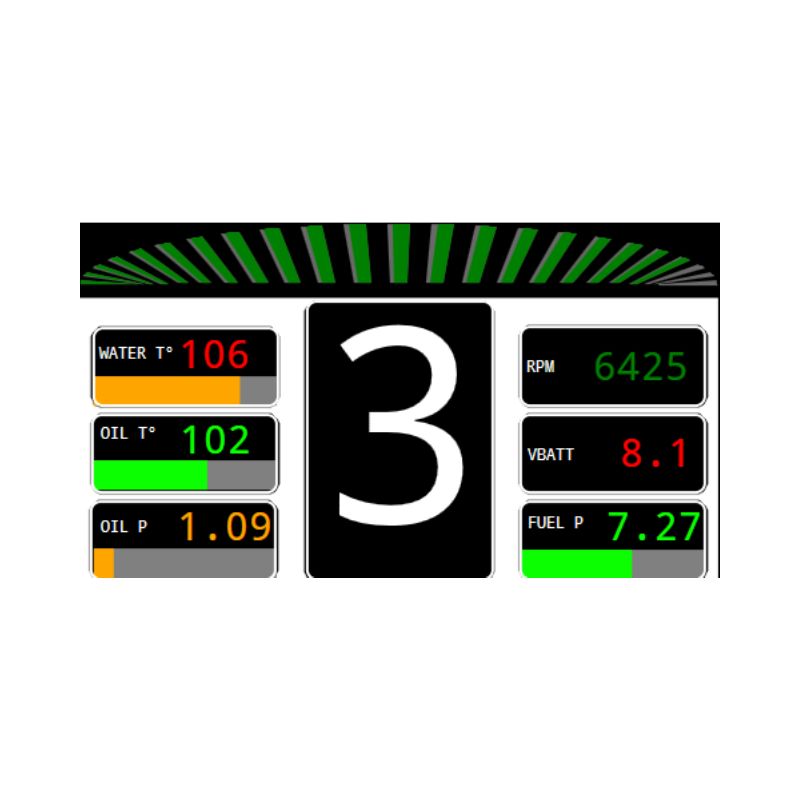 Le NTX FULL COREVIEW est livré avec des pages d’affichage pré-définies (performance, moteur, diagnostic, GPS, supervision), des canaux moteur et système déjà mappés, ainsi que des alertes et seuils fonctionnels pré-calibrés. Cette configuration permet une prise en main immédiate et une utilisation directe, sans phase de développement complexe.