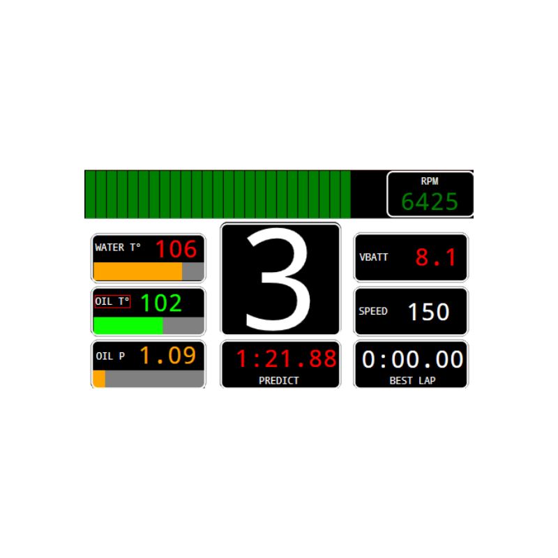 Le NTX FULL COREVIEW est livré avec des pages d’affichage pré-définies (performance, moteur, diagnostic, GPS, supervision), des canaux moteur et système déjà mappés, ainsi que des alertes et seuils fonctionnels pré-calibrés. Cette configuration permet une prise en main immédiate et une utilisation directe, sans phase de développement complexe.